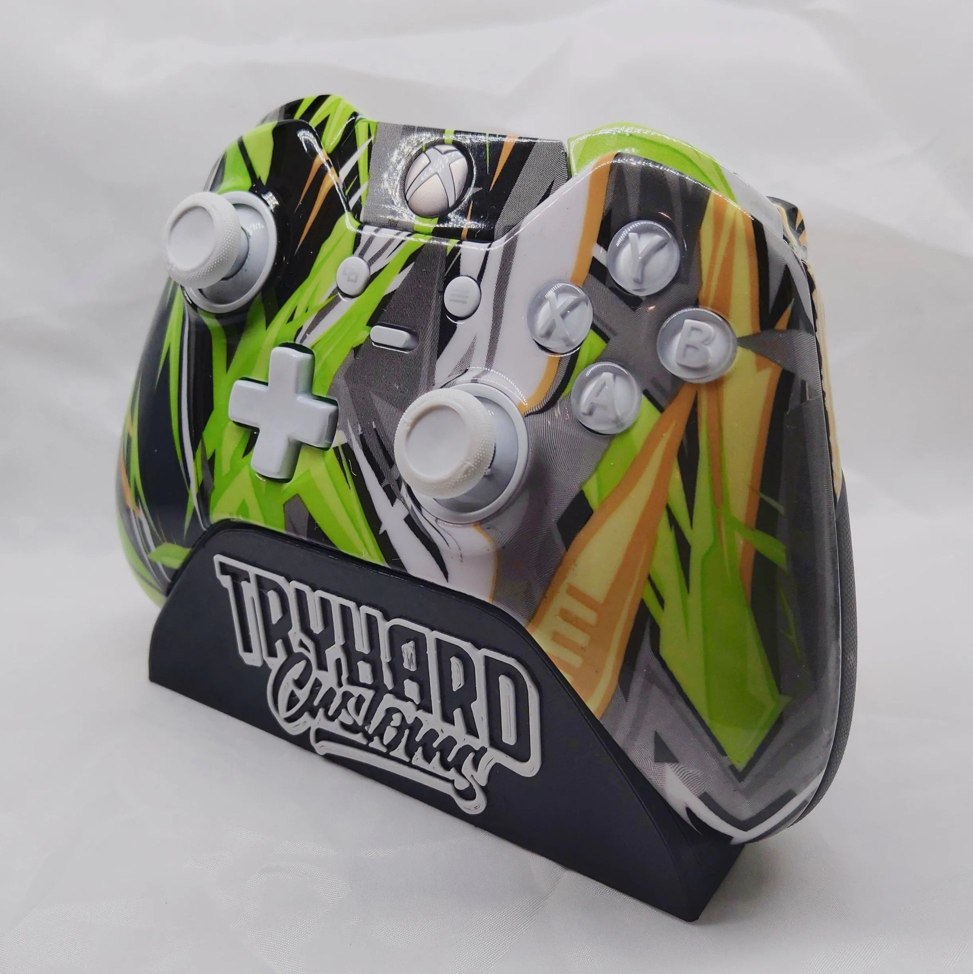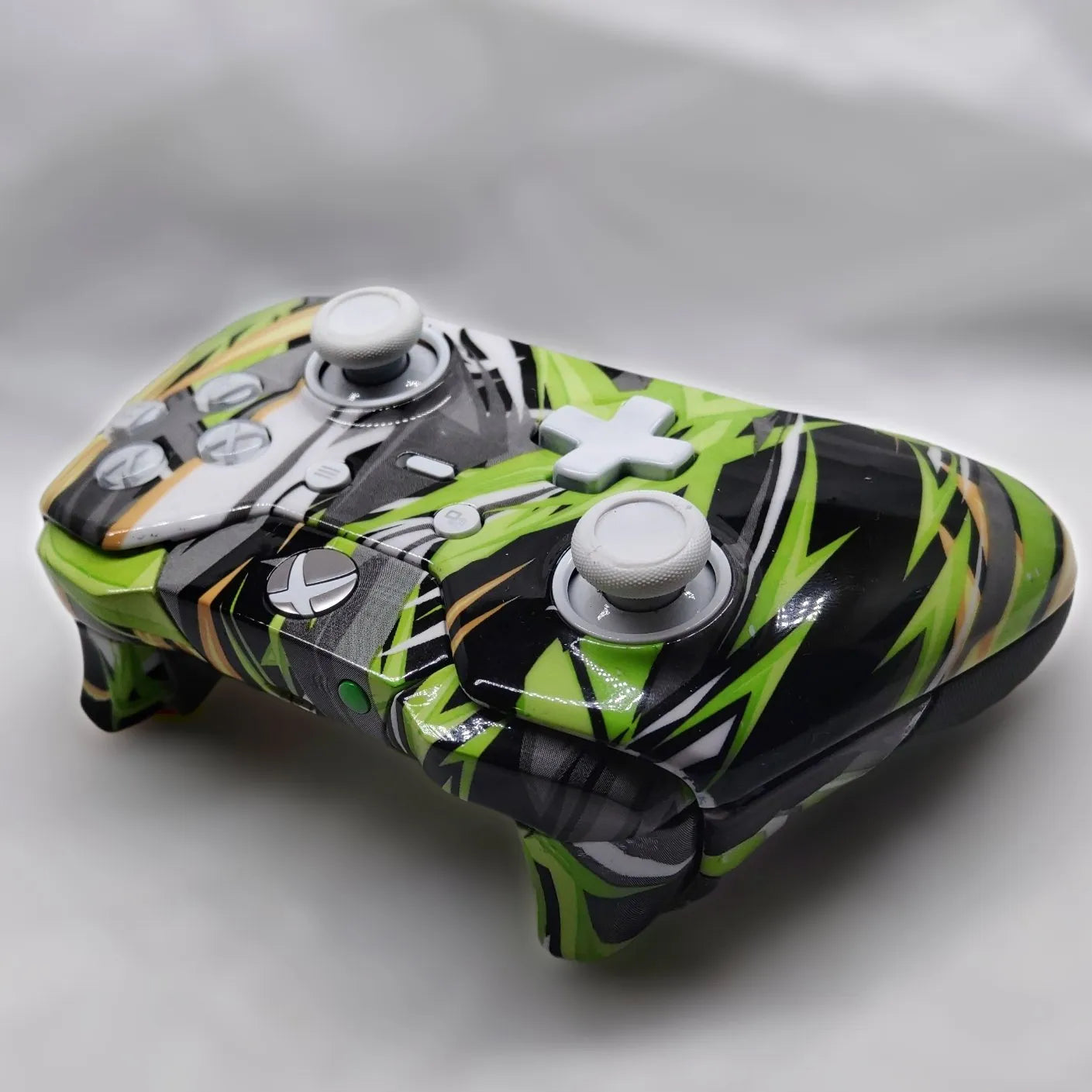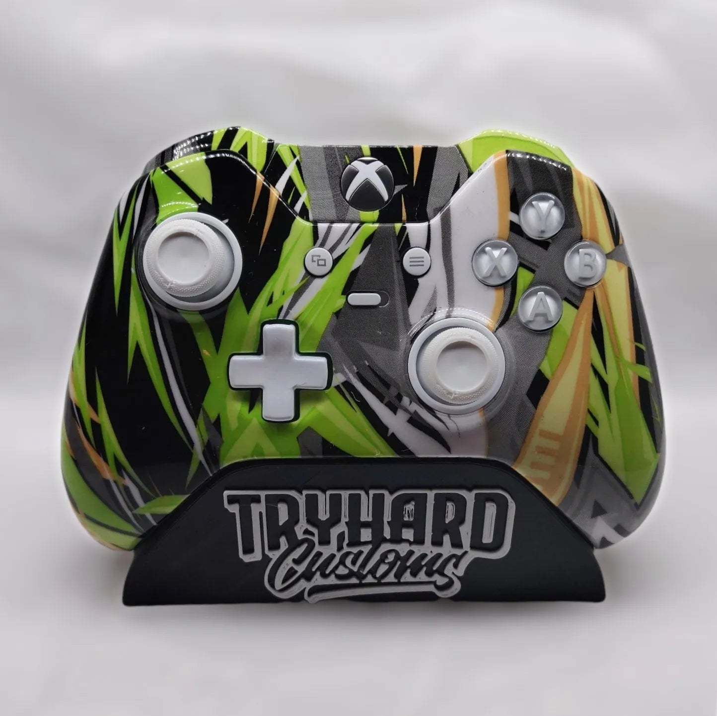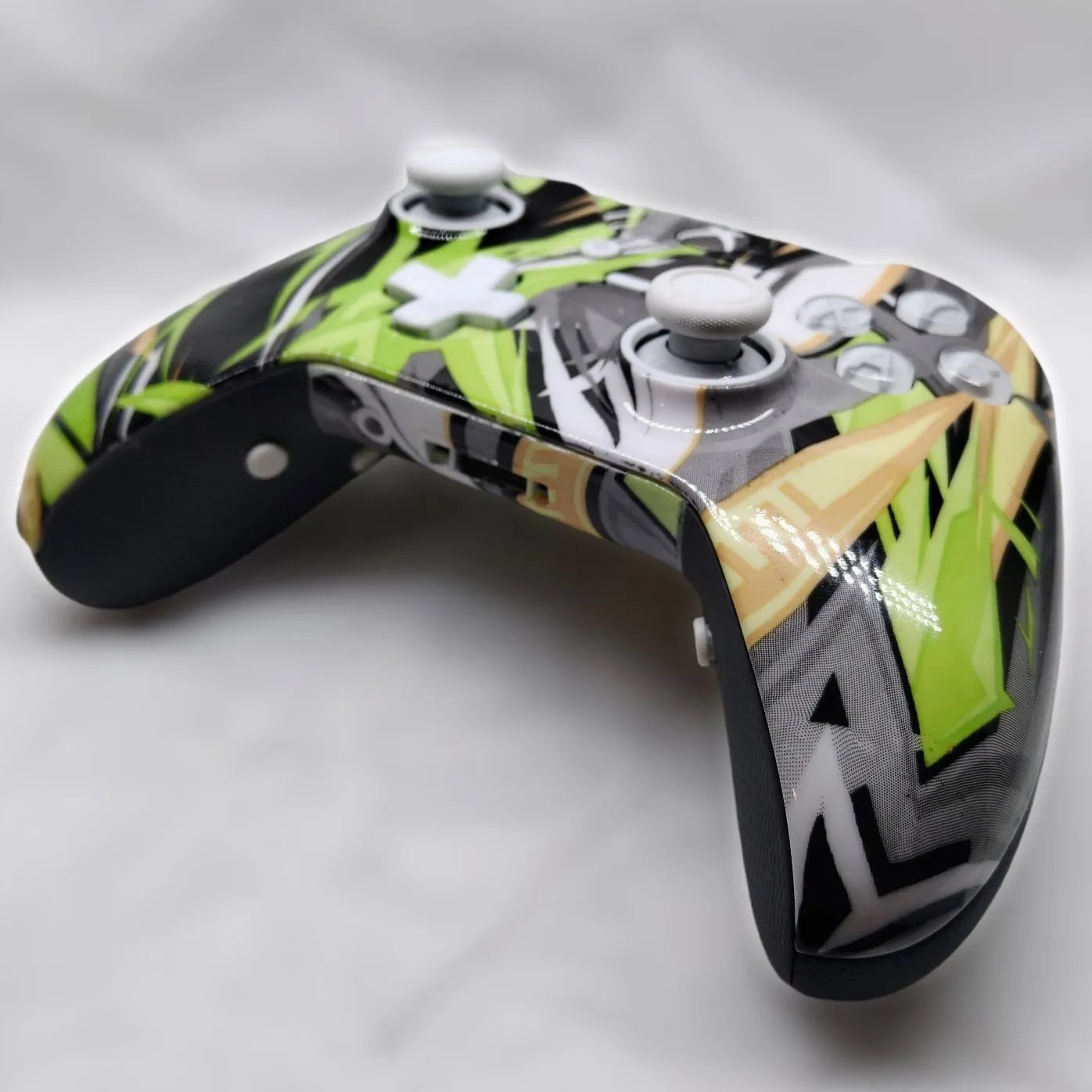 Wow I’m hyped about this one, put so much work into the custom paint job, feel like it came out perfect! This 100% custom and upgraded Elite Series 1 has almost every part hydrodipped in the “Yellow Grunge” pattern including the faceplate, the side grips, the backplate, battery cover, triggers, bumpers, and guide button assembly. Clear coated with a nice 2k gloss finish, it totally changes the look of it and makes it completely unique! Also if you look closely, you can see I painted the magnetic thumbstick bases white to bring it all together! This is truly one of a kind, I haven’t seen anyone else doing front-to-back custom designs on elites like this! (I can see why, it’s extremely time consuming!)